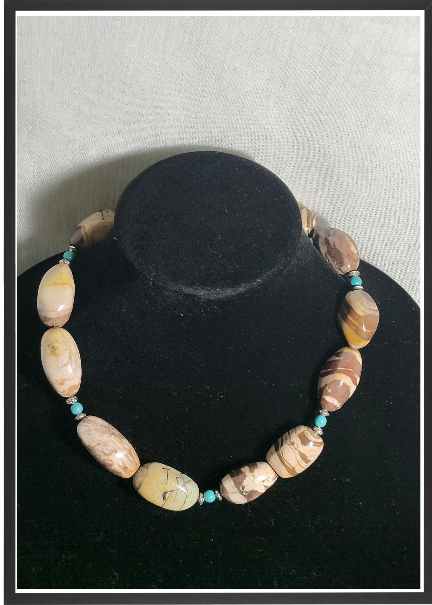Jasper Turquoise Necklace. This gorgeous semi precious stone necklace is a true statement piece. It measures approx. 18'' - 21'' long. With a toggle clasp.